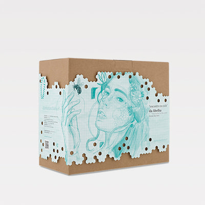 A caixa é feita em cartão microcanelado e envolvida por uma cinta de papel, que contém uma ilustração e o conto “encontro no ciclo” da Abelha - procura enaltecer a resistência silenciosa que estes seres vivos carregam: o fardo do inverno, a entrega ao ciclo, a persistência que mantém a terra viva. Traduzido para Português e Inglês.