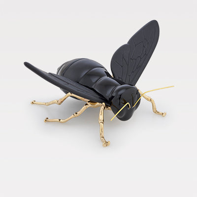 “encontro no ciclo” da Abelha é uma representação de uma observação própria, em faiança, vidrada segundo a tradicional técnica de pintura manual a vidro. Esta peça, puramente decorativa, é enobrecida por um corpo em latão natural ou oxidado, fundido manualmente em molde de areia. A combinação única destes dois materiais, recria um símbolo do equilíbrio e da elegância. As peças são feitas à mão, podendo apresentar pequenas variações.